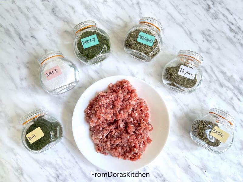 - In the bowl, using your hands, mix ground meat, dry basil, dry oregano, dry dill weed, dry thyme, baking soda, salt, and pepper until combined. Form the meatballs, slightly larger than a golf ball.