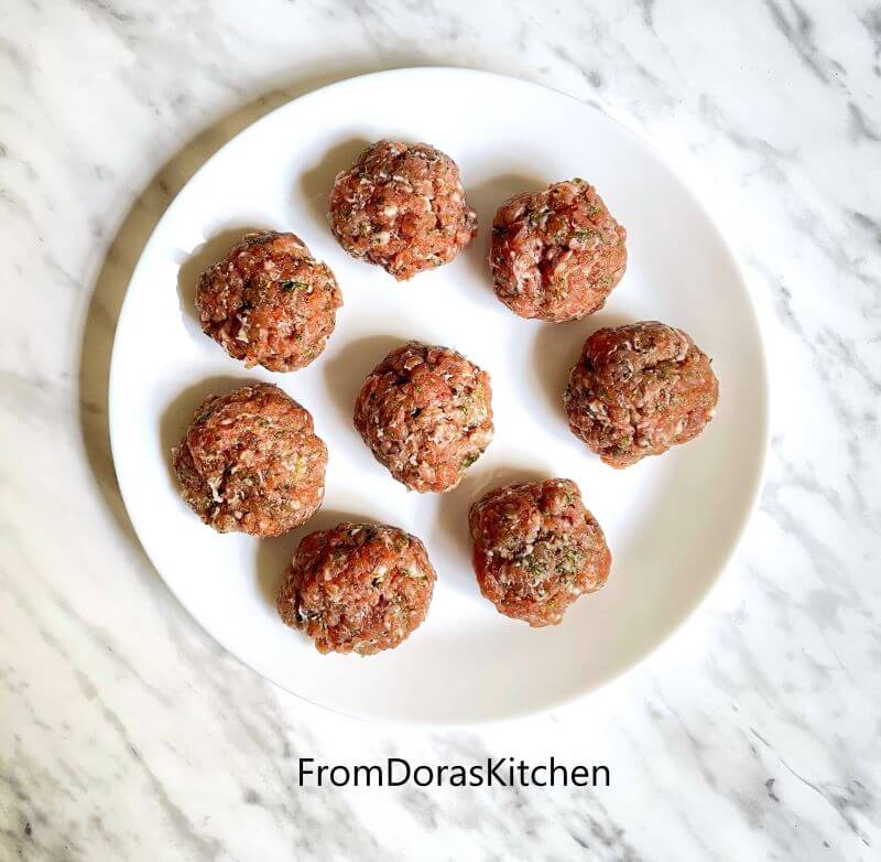In a bowl, using your hands, mix ground meat, dry basil, dry oregano, dry dill weed, dry thyme, baking soda, salt, and pepper until combined. Form the meatballs, slightly larger than a golf ball. You can shape them into the size of the tennis ball too, but then you will have to bake them for a few minutes longer.