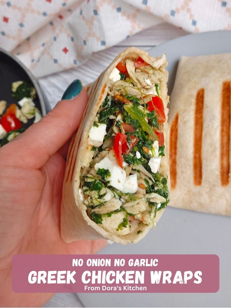 Greek Chicken Wraps without onion without garlic are the perfect healthy and low-calorie meal. It is easy and quick to make, but the taste is divine. The combination of chicken breast, spinach, feta cheese, tomato, and herbs wrapped in the tortilla is a dream come true for everyone who can’t eat alliums, have GERD, gallstones, sensitive stomach, IBS, or SIBO. It is a perfect meal to enjoy carefree, not thinking about stomach or allergy problems, and definitely not thinking about calories.