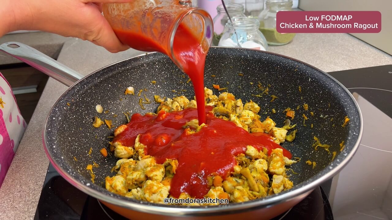 - Add tomato puree, and stir it to combine. Add water, cherry tomato, stir it, and let it simmer until majority of the water evaporates. The LOW FODMAP Chicken ragout has to be thick.