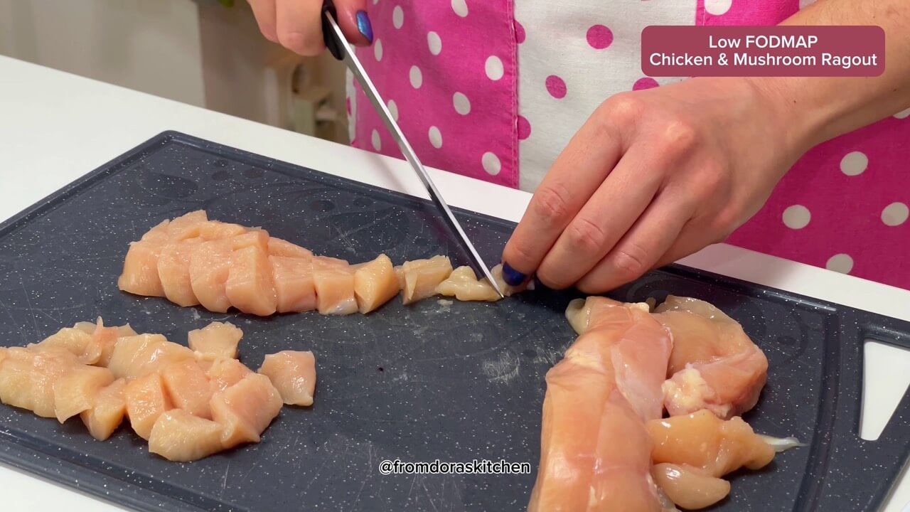 - Cut boneless and skinless chicken breast into small to medium size cubes.