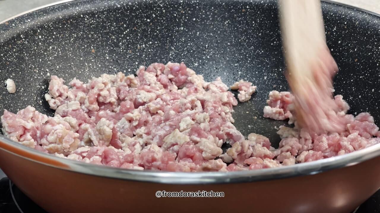 - When the oil gets hot, add ground meat to the pan. Saute the meat with a wooden spoon while constantly stirring to crumble the ground meat. Use a wooden spoon to break the big chunks of meat into smaller ones.
