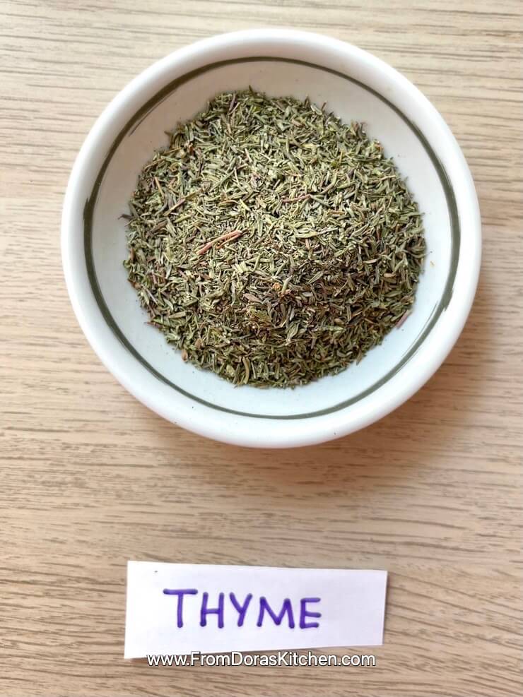Dry thyme is a very sturdy and strong spice. It can stand the heat for a long time when in fresh form, and it has an intense flavor, so you can combine it with most stews and pasta sauces. Thyme has an herbaceous and earthy flavor that pairs well with pasta sauces, meat, and stews. I love pairing thyme with button mushrooms because it brings out the flavor in the mushrooms.