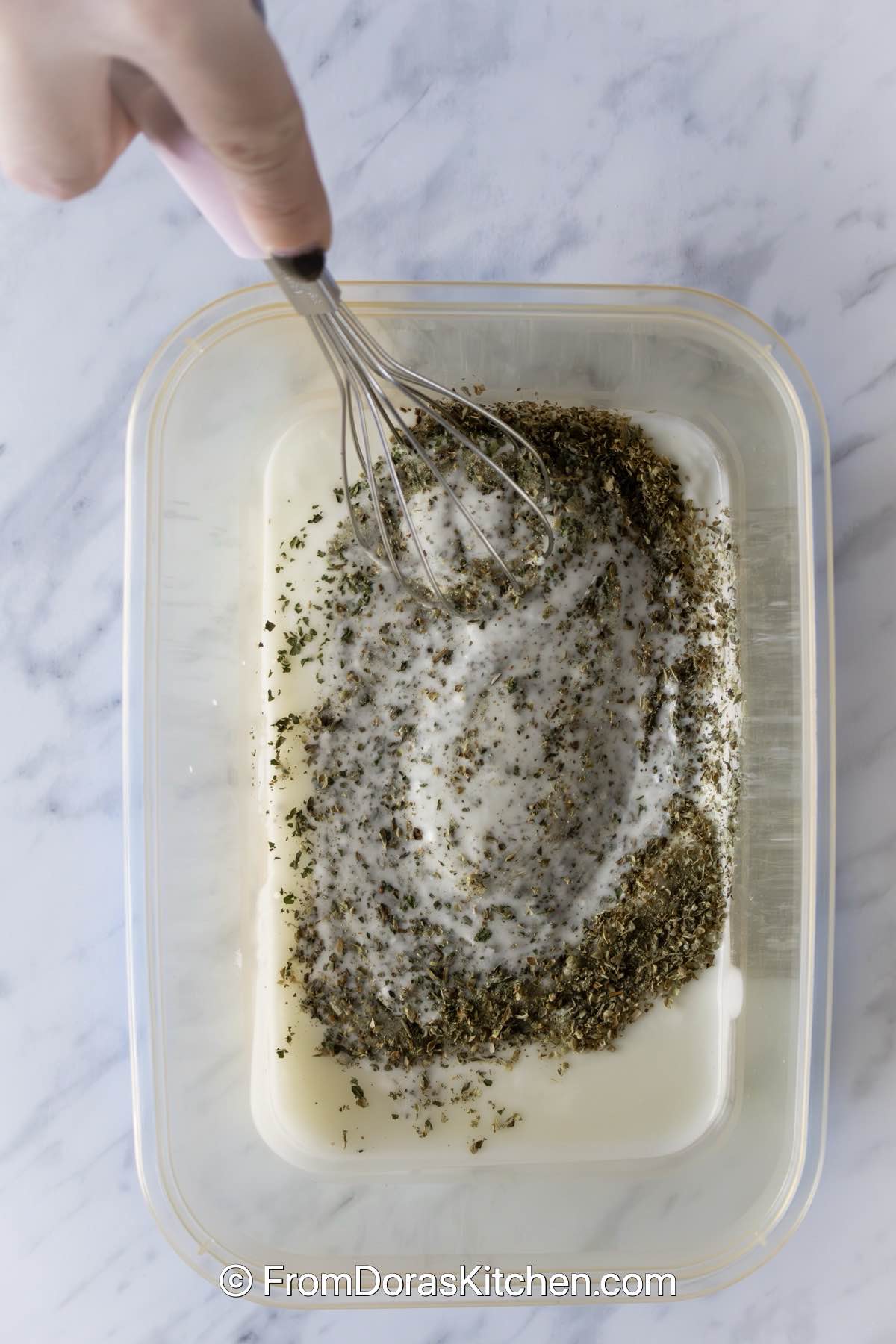 - In an airtight container whisk together plain yogurt, lemon juice, dried oregano, dried basil, ground oregano, salt, and black pepper. Taste and adjust the salt and pepper if necessary. Set aside.