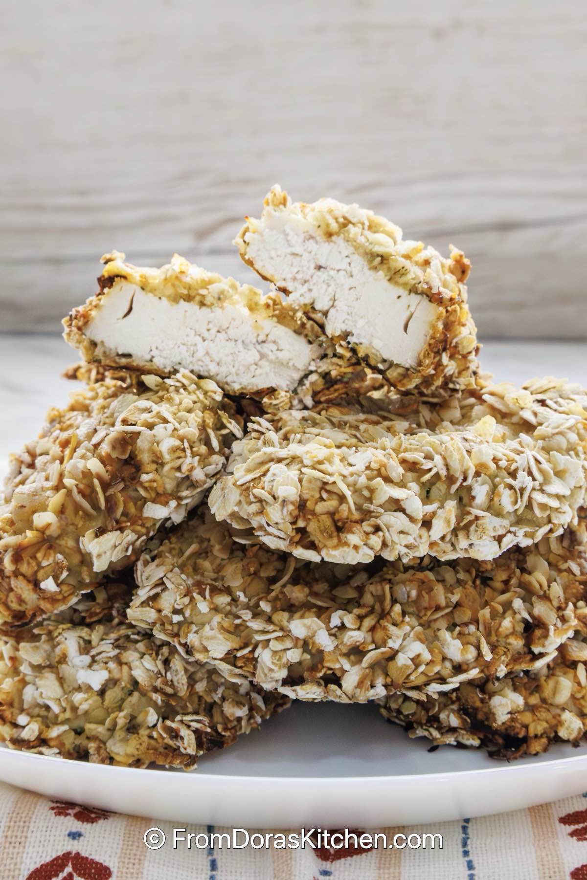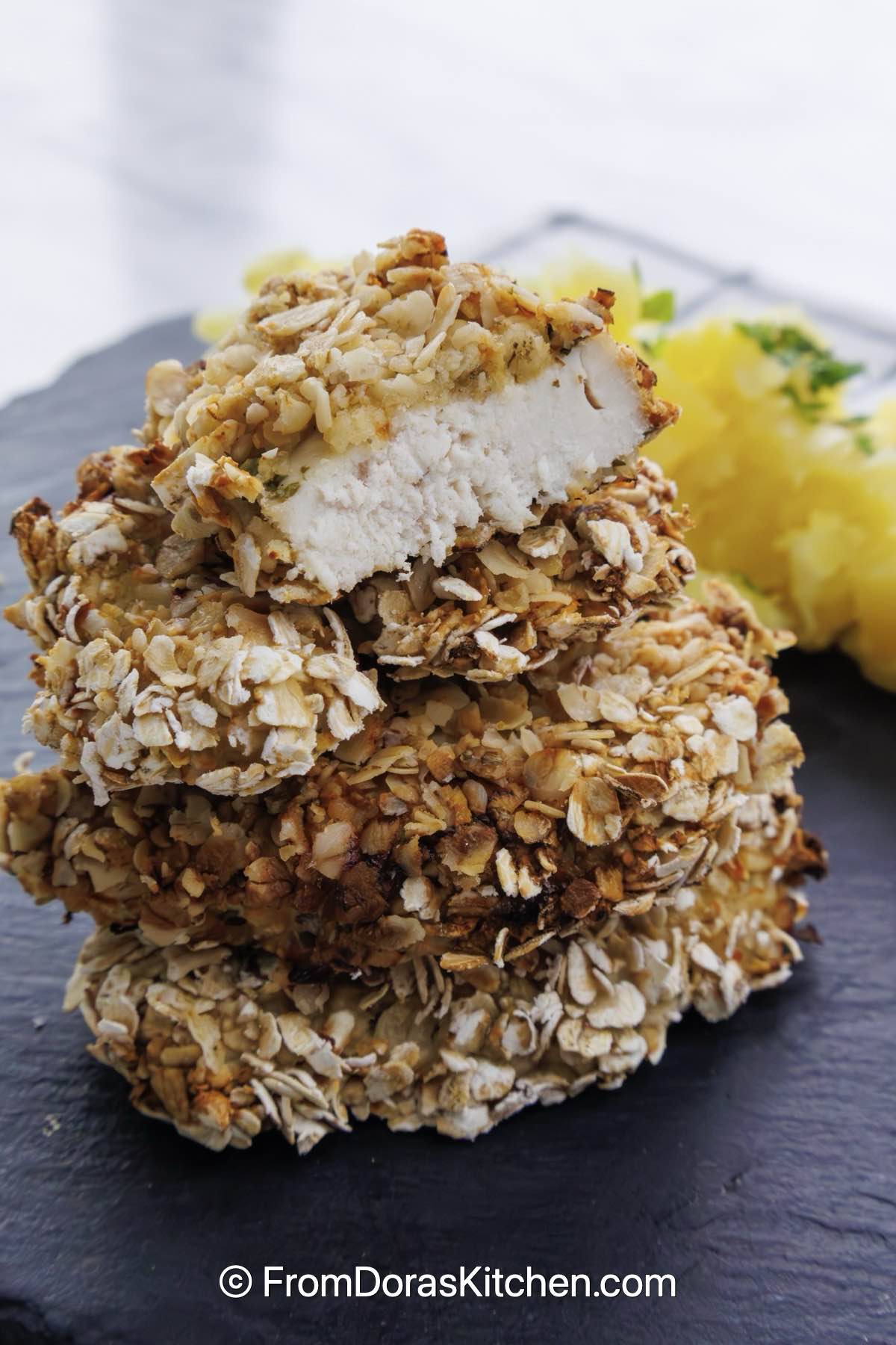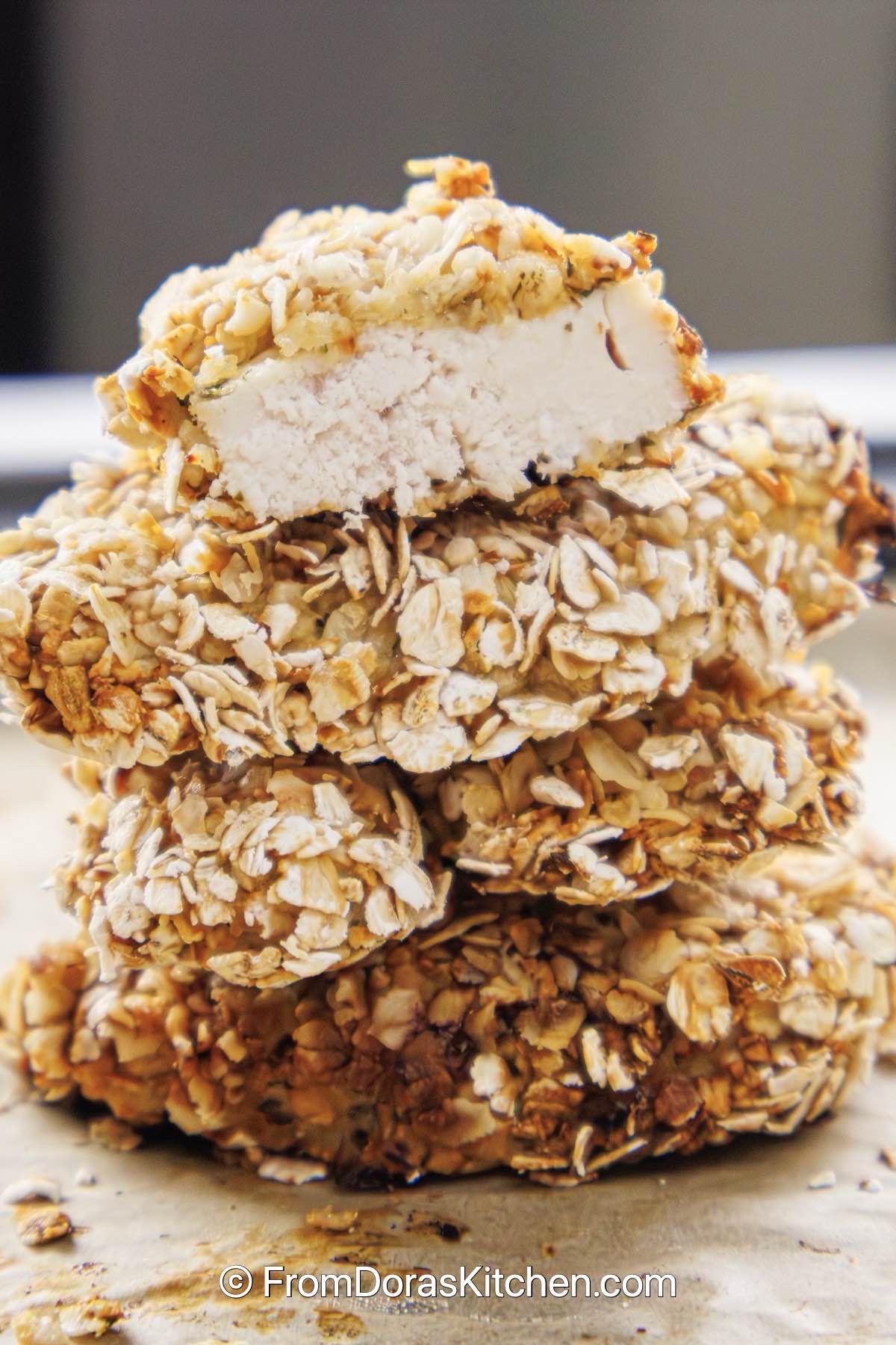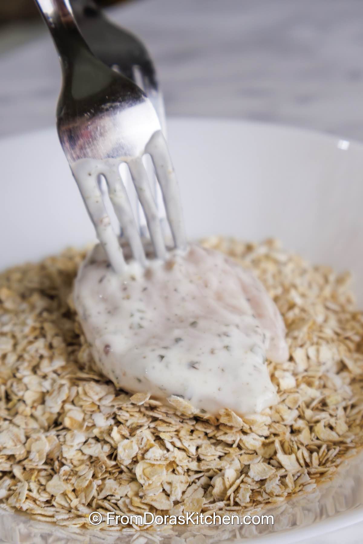 - Add a small amount of rolled oats to a plate, then coat the chicken evenly in oats on both sides, not too thick and not too bare. If the oats start clumping, add more rolled oats as you go.