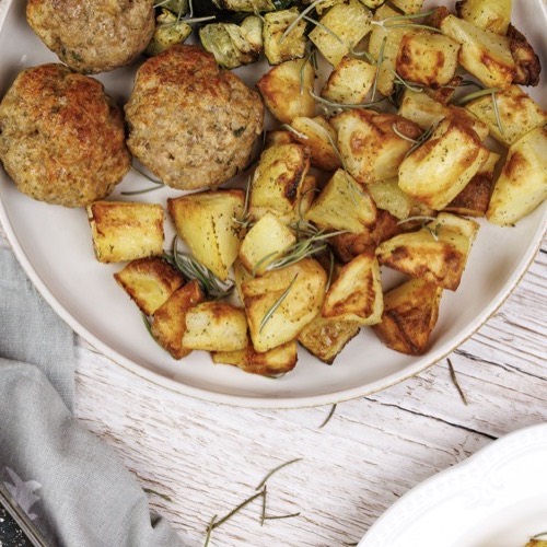 - After 10 minutes, add the meatballs to the pan. Continue baking for 25 to 30 minutes, or until the meatballs are fully cooked (165°F / 75°C inside) and the potatoes are crispy on the outside and tender on the inside.