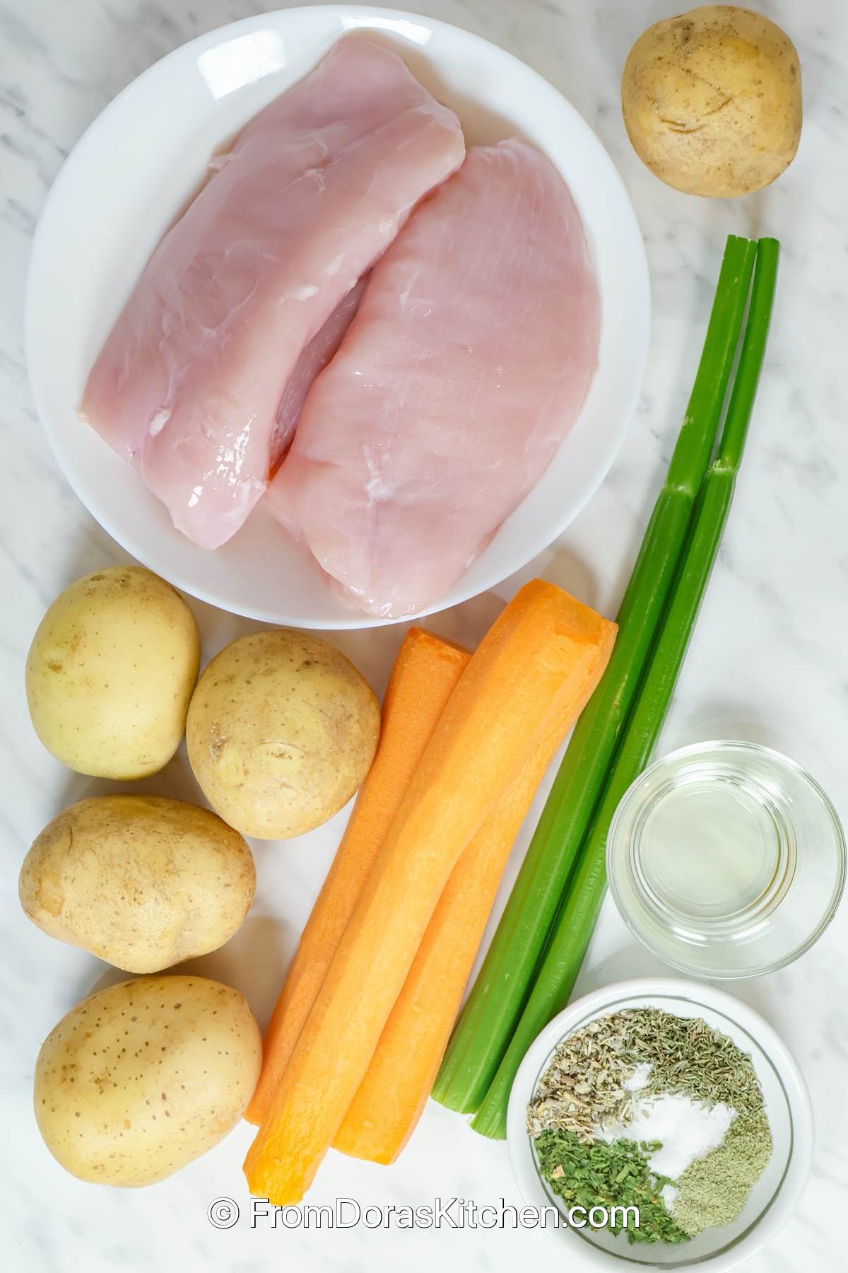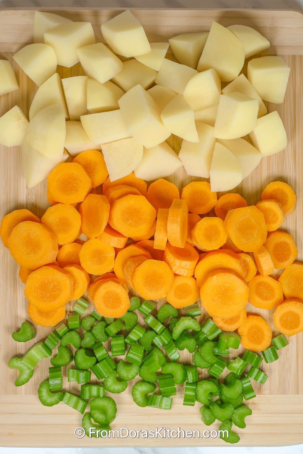 - Wash and peel potatoes and carrots. Cut potatoes in large cubes, and slice the carrots into rounds. Wash celery sticks, and slice them into small pieces.