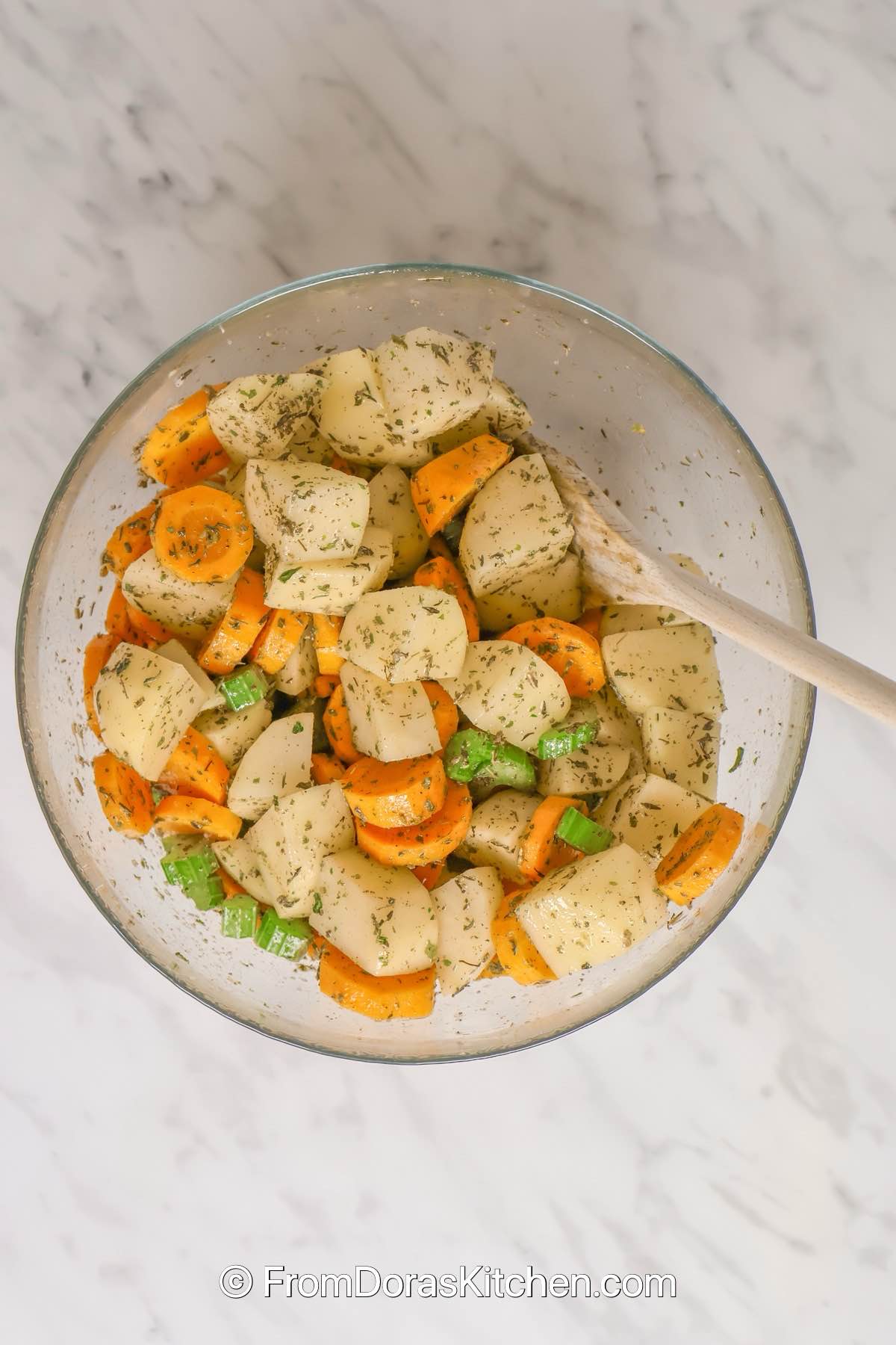 - Put cut vegetables in a large mixing bowl. Drizzle them with oil, and add dry sage, dry thyme, dry rosemary, salt, and pepper. Toss to coat evenly.