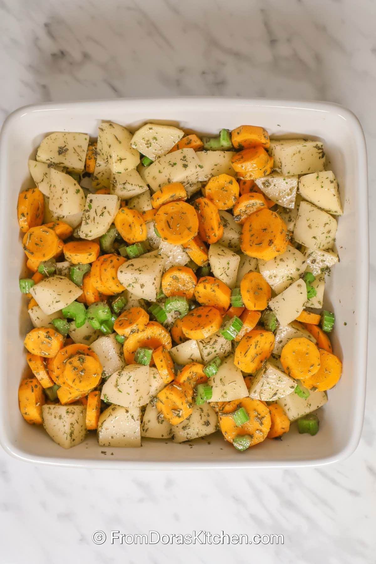 Put vegetables into a bowl, season them with the herbs, and toss to combine. Put them in the baking dish.