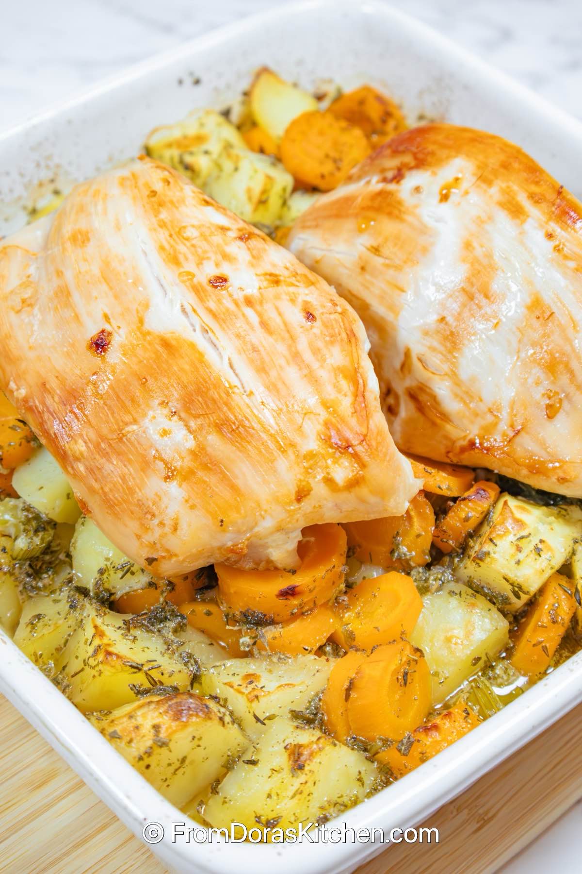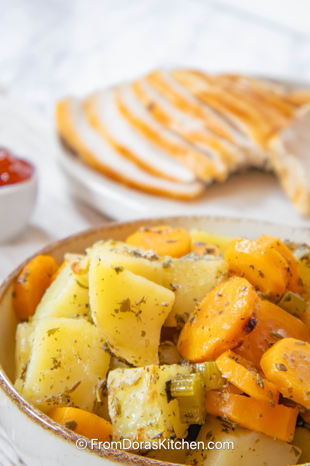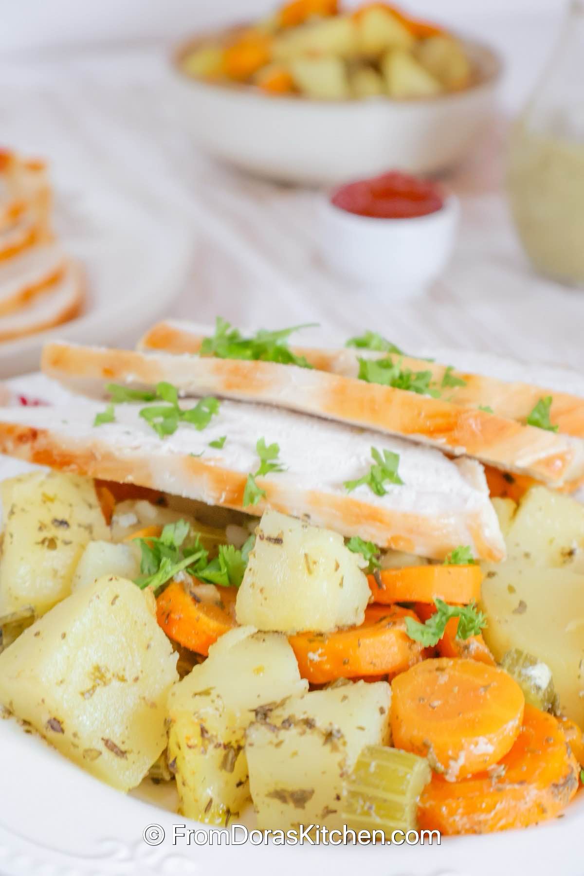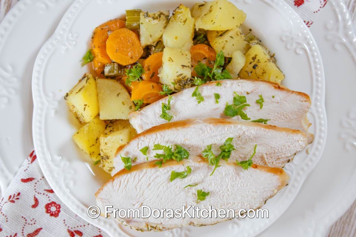 - Remove from the oven and let rest for 5 minutes. Slice the turkey breast and serve warm with the roasted vegetables.